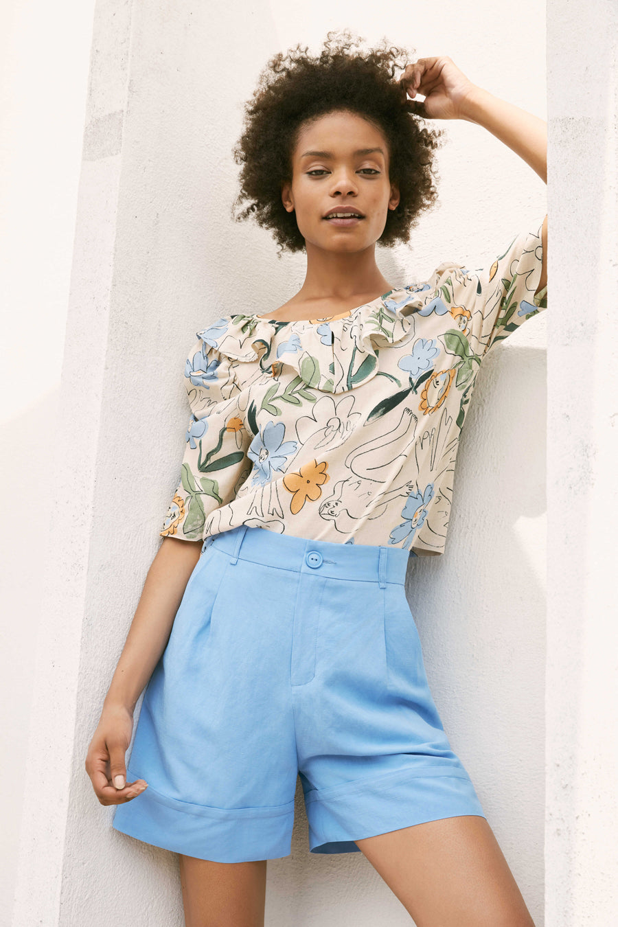 Details: Button and a zipper as a fastening at the front. They are fitted at the waist and then loose at the bottom to create a volume effect. They have large side pockets. These light and fluid high-waisted shorts will be your 'go to' for this season.
