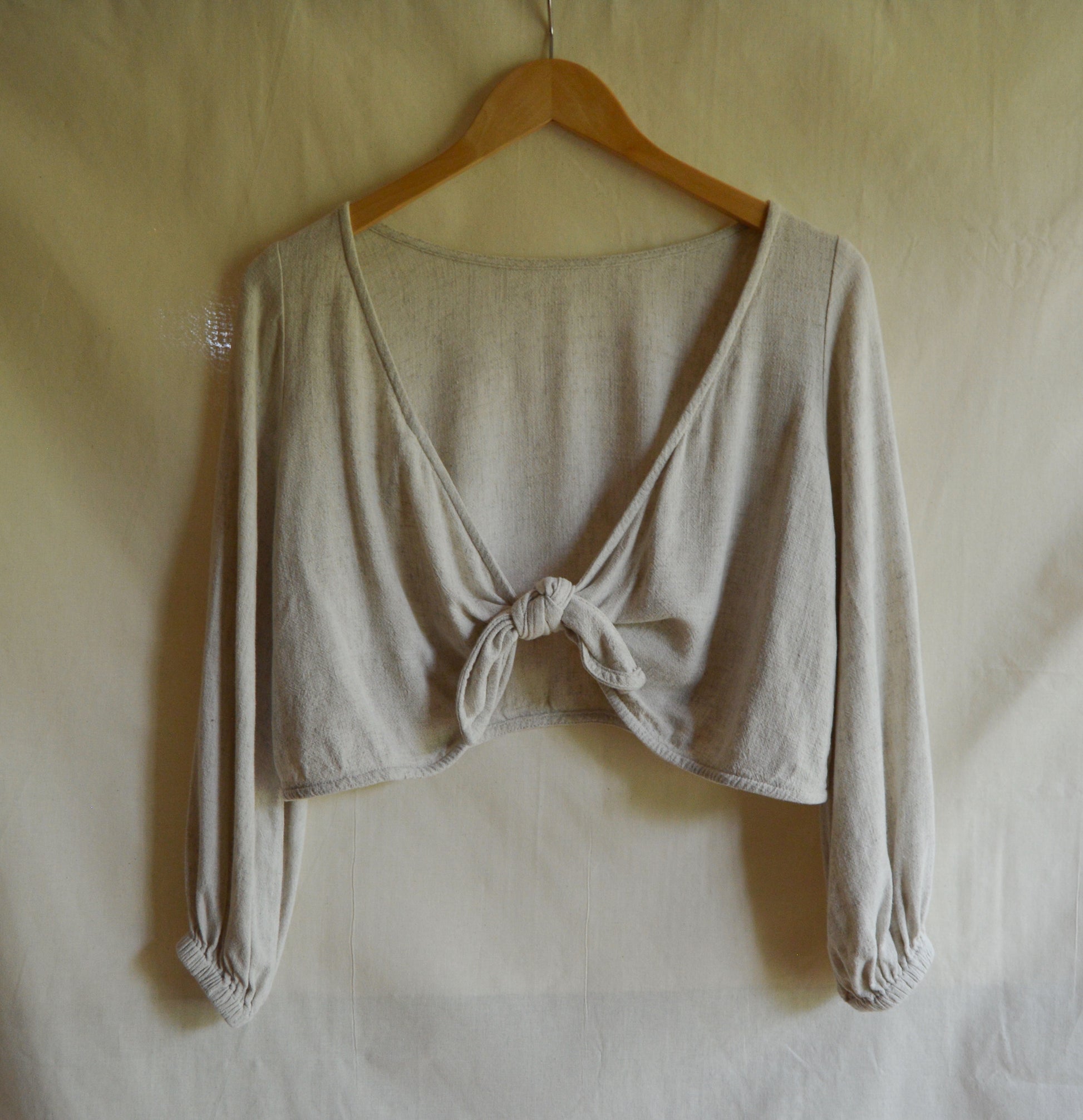 Details: Cropped, adjustable open tie back, elastic sleeves that hit above the wrist, might be best with a strapless bra or an adhesive bra. The perfect balance of sexy and causal.