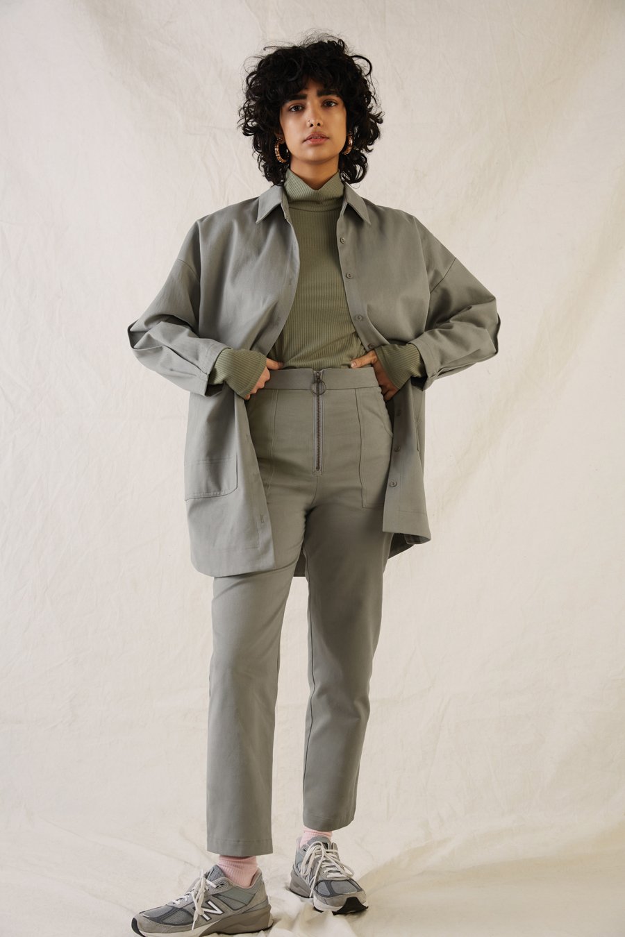 Details: Straight cut pants with large patch pockets on the side and a zipper on the front.