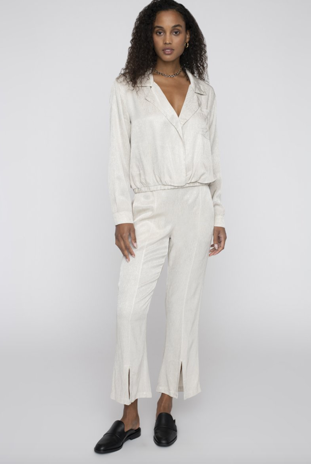 Details: A luxurious satin jacquard pant with front slit openings, cropped hemline, and clean side-seam pockets. Slim-fitting with its flat-front waistband and elasticized back, make this wide leg pant a seasonal update.