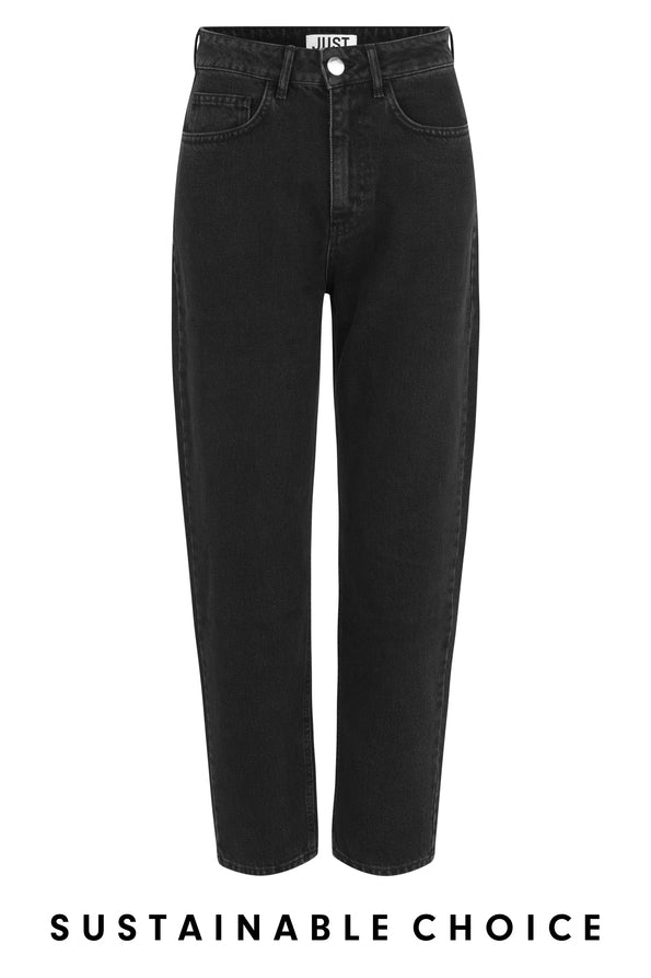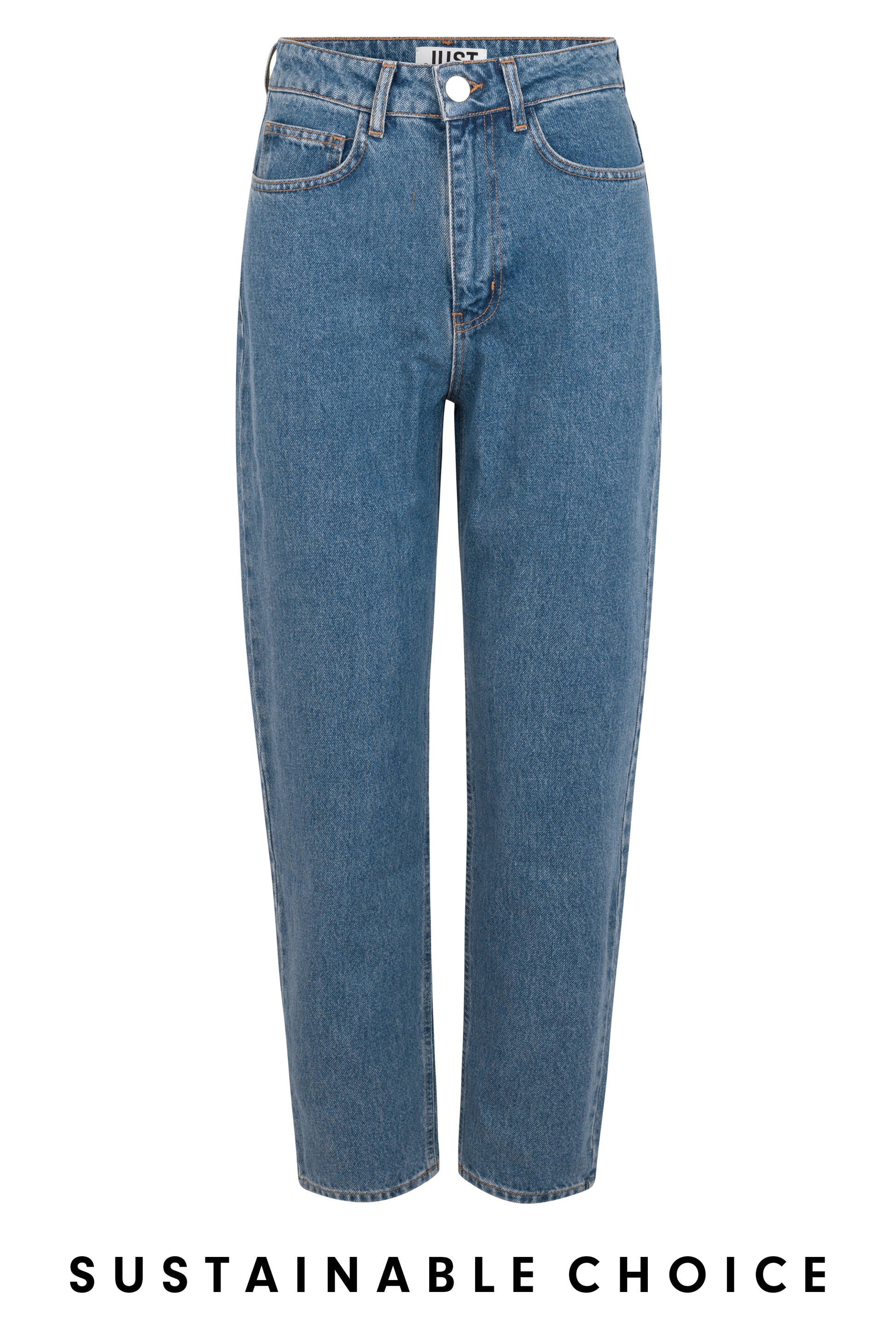 Details: These jeans have a fixed waistline, belt loops, hidden zipper, and visible silver button.. On the back of the waistband is a brown leather badge. Part of the JUST Female SUSTAINABLE CHOICE initiative.